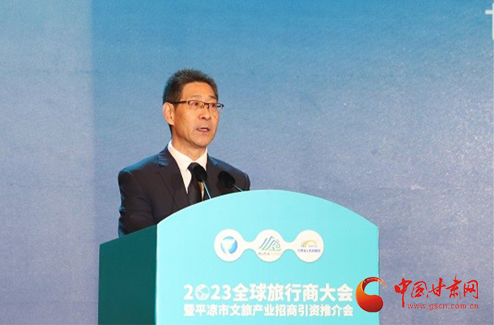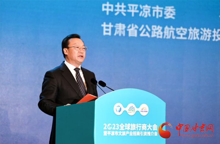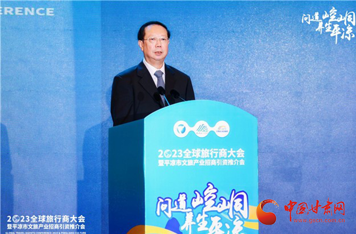 何效祖在致辭中說,平?jīng)鍪歉拭C向東開放的“門戶”城市,是風(fēng)景宜人的旅游城市,是甘肅布局的文旅康養(yǎng)基地和支撐“一核三帶”區(qū)域發(fā)展格局中的重要支點(diǎn),擁有崆峒山、大云寺·王母宮、瑤池溫泉等眾多聞名遐邇的人文和自然景觀。今天,我們與平?jīng)鍪形姓⒅袊?guó)旅行社協(xié)會(huì)、甘肅公航旅集團(tuán)一道搭建平臺(tái),誠(chéng)邀各位嘉賓走進(jìn)甘肅、深入平?jīng)觯M織開展宣傳推介、洽談合作、展示展銷、考察踩線等系列活動(dòng),就是要引導(dǎo)大家深度感知甘肅高質(zhì)量發(fā)展的強(qiáng)烈愿望,實(shí)地觸摸甘肅文旅如火如荼的生動(dòng)實(shí)踐,誠(chéng)懇表達(dá)隴原兒女“視企業(yè)家為最寶貴財(cái)富”的真誠(chéng)合作和赤誠(chéng)服務(wù)之心。我們衷心希望,廣大中外旅行商和文旅專家、文旅企業(yè)家以本次大會(huì)為契機(jī),加強(qiáng)交流互鑒,深化務(wù)實(shí)合作,加大在甘投資力度,組織更多游客到甘肅觀光旅游,帶動(dòng)更多優(yōu)質(zhì)文旅企業(yè)和項(xiàng)目落戶甘肅,合力譜寫甘肅文旅高質(zhì)量發(fā)展的嶄新篇章!