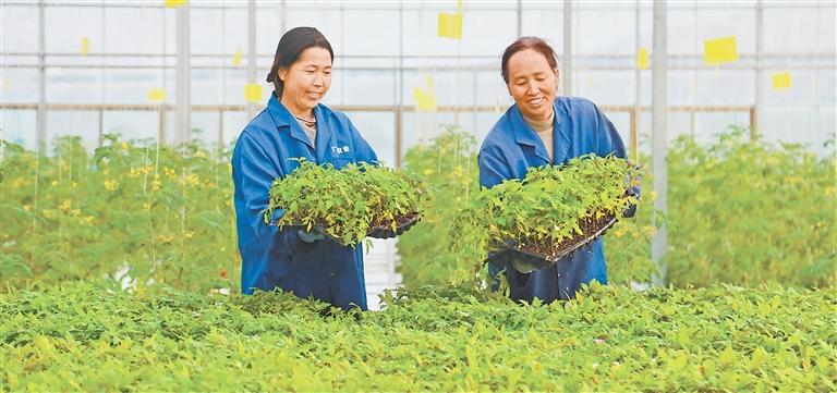 隴南市武都區石門鎮青隴現代農業產業園里,產業工人忙著搬運西紅柿育苗盤