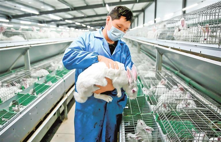 在武都區坪埡易地扶貧搬遷后續產業示范園里,康大肉兔養殖場的工人檢查肉兔生長情況