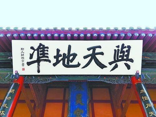 “與天地準”出自《周易·系辭傳上》。原句為:“易與天地準,故能彌綸天地之道”。準,意為等、等同(此依高亨解)。有學者或將“準”解釋為標準,或解釋為法則等,唯高解最貼原意;彌,意為遍,普遍;綸,意為絡,包絡。彌綸,意即普遍包絡。此句可釋為:《易》所闡述的“性命之理”是與天地運行的自然法則等同的,所以它能夠包容天地之間萬事萬物的運行規律。匾文“與天地準”,是贊頌伏羲首創的八卦,高度概括了天地萬物運行之規律,為人們認識世界、改造世界提供了思想武器。