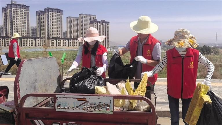 在劉先生身后不遠處,志愿者、網格員、環衛工人等正在清理路旁垃圾,此時正值上午10時30分,驕陽似火,在經四路與緯二十二路交界處,大家不畏炎熱,認真撿拾著散落四處的垃圾,不論是煙頭紙片、白色垃圾,還是在雜草間的雜物,都被一一撿出,放在隨身攜帶的垃圾袋中,統一放回垃圾清運車。