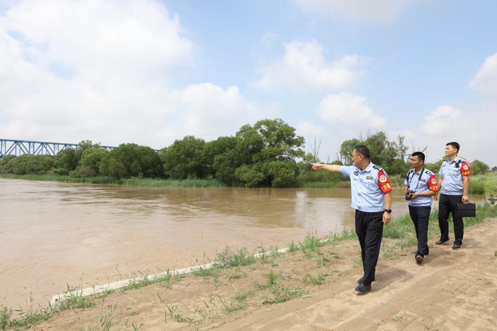 黃河派出所和黃河河務局水政監察大隊人員對刁口河生態補水進行巡查。新華社記者 劉詩平 攝