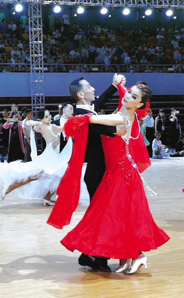 當天的蘭州奧體中心綜合館內燈光璀璨、激情四射。伴著或動感或舒緩的音樂,優雅浪漫的華爾茲、熱情奔放的探戈、性感狂野的倫巴……舞者們依次上場,將最優美、最富激情、充滿藝術活力與創造力的高水平體育舞蹈展現在觀眾和裁判面前。