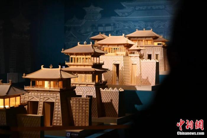 《千年營造——敦煌壁畫中的建筑之美》特展上的古代建筑模型。該模型的“單門道花磚城門”來源于莫高窟第159窟。李亞龍 攝