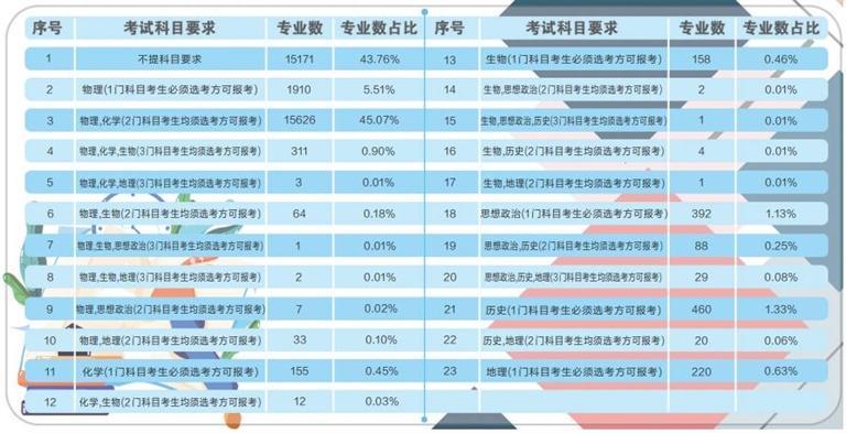 據(jù)了解,根據(jù)《甘肅省深化高等學(xué)校考試招生綜合改革實(shí)施方案》要求,從 2021年秋季入學(xué)的普通高中一年級學(xué)生開始,實(shí)行基于統(tǒng)一高考和高中學(xué)業(yè)水平考試成績、參考綜合素質(zhì)評價(jià)的高校考試招生模式。到2024年,基本形成分類考試、綜合評價(jià)、多元錄取的高??荚囌猩贫龋∪龠M(jìn)公平、科學(xué)選才、監(jiān)督有力的高??荚囌猩w制機(jī)制。此次在我省報(bào)送選考科目要求的高校專業(yè)共計(jì)64092條,其中本科專業(yè)34670條。專業(yè)選考科目要求共有23種組合,其中不提科目要求的本科專業(yè)數(shù)量占本科專業(yè)總數(shù)的43.76%,含物理科目的占比為51.79%,含化學(xué)科目的占比為46.46%,含歷史科目的占比為1.74%,含“物理+化學(xué)”科目的占比為45.98%。