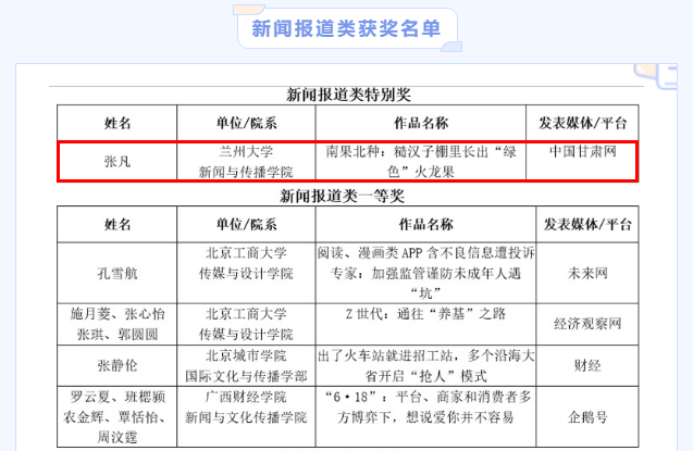 蘭州大學新聞與傳播學院獲獎中,張凡的作品《南果北種!糙漢子棚里種出“綠色”火龍果》在中國甘肅網刊發,系蘭州大學新聞與傳播學院、中國甘肅網聯合舉辦的第十三屆“重走中國西北角”接力采訪活動新聞作品。