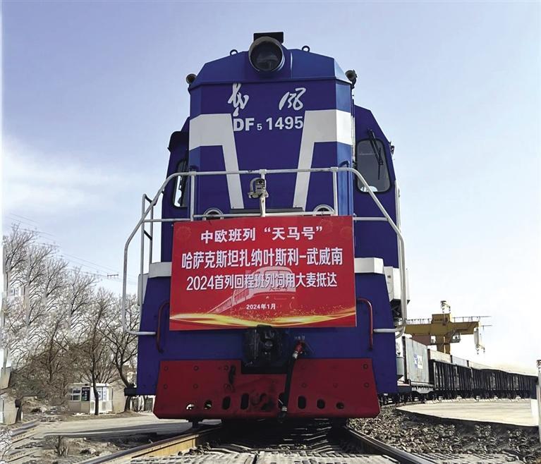 中國甘肅網1月18日訊 據蘭州晚報報道 日前,一列搭載62個集裝箱1600多噸,貨值406萬元的哈薩克斯坦進口糧飼回程班列抵達武威南站,這是今年中鐵蘭州局集團公司蘭州貨運中心首趟中歐進口糧飼專列。此趟班列在蘭州貨運中心、市商務局和金昌海關共同謀劃下,從哈薩克斯坦扎納葉斯利出發,由阿拉山口入境,歷時8天,順利抵達武威南貨場。