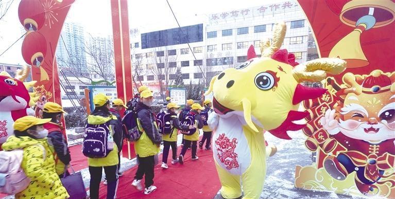 當(dāng)日上午7時(shí)許,記者在蘭州市東郊學(xué)校看到,校門內(nèi)兩邊擺放著兩條由數(shù)百個(gè)氣球組成的長(zhǎng)龍。高年級(jí)段和低年級(jí)段的學(xué)生要穿越寫著“龍騰虎躍,前程似錦”的龍門,方可進(jìn)入教室。同時(shí),兩邊的老師,給每一位到校的學(xué)生發(fā)放小禮物。記者注意到,每個(gè)孩子都領(lǐng)到了一個(gè)小盲盒,里面裝著不同的文具。孩子們高興地?fù)]舞著手中的盲盒,展示新春的快樂。
