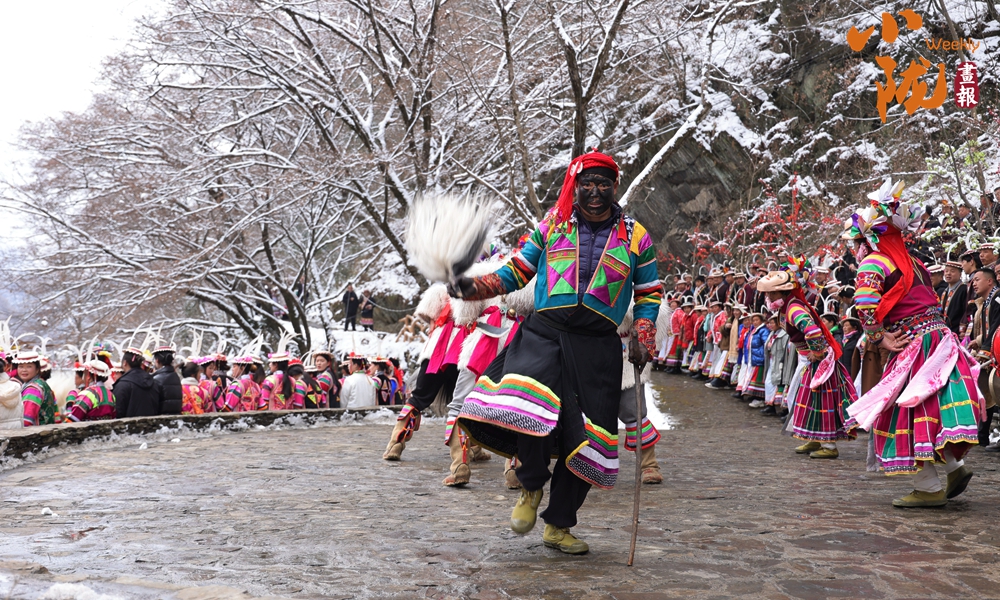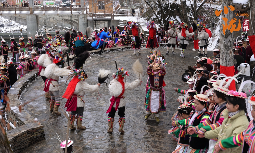 河畔的小路上和河岸的觀景臺(tái)上,白馬人身著特色服飾,錯(cuò)落有致,載歌載舞,跳起了獨(dú)具魅力的“池哥晝”。
