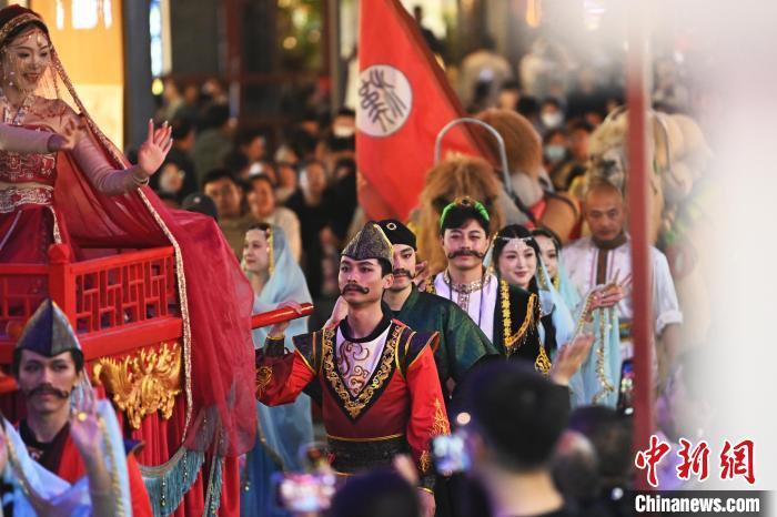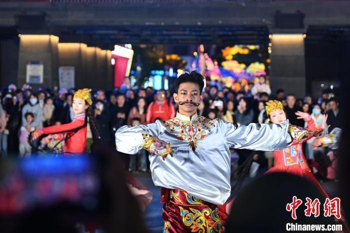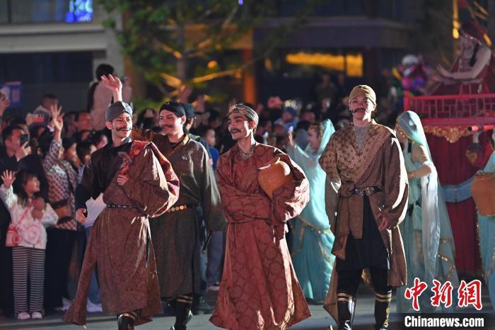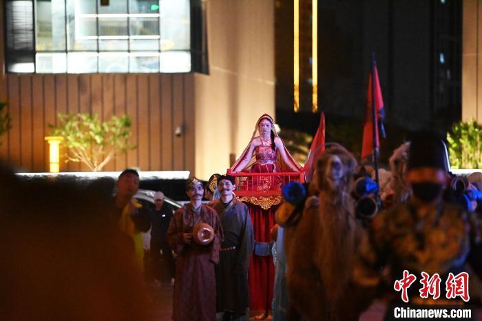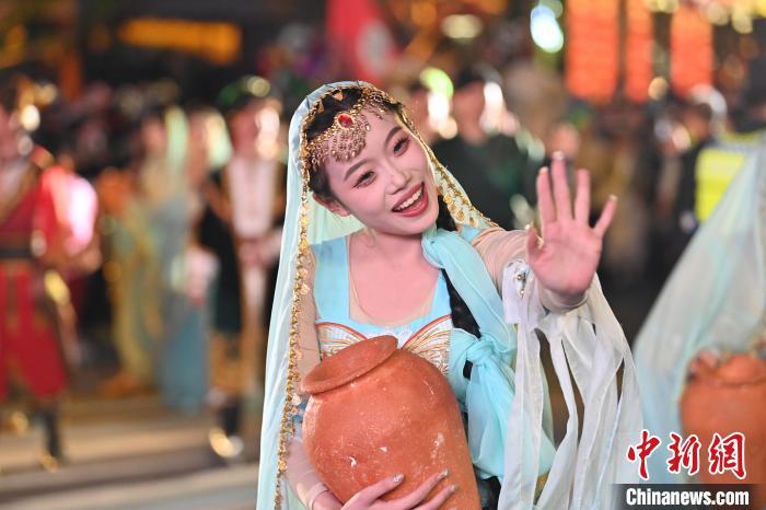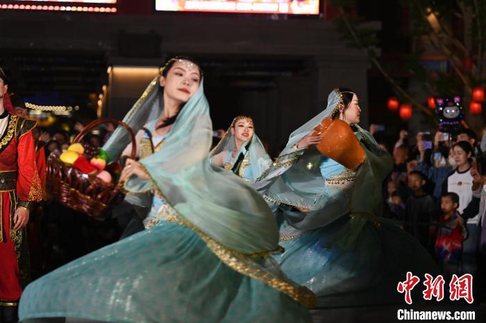 5月3日晚,甘肅省蘭州市七里河區蘭州老街上演的大型情景巡游《樓蘭之旅》吸引游客。李亞龍 攝