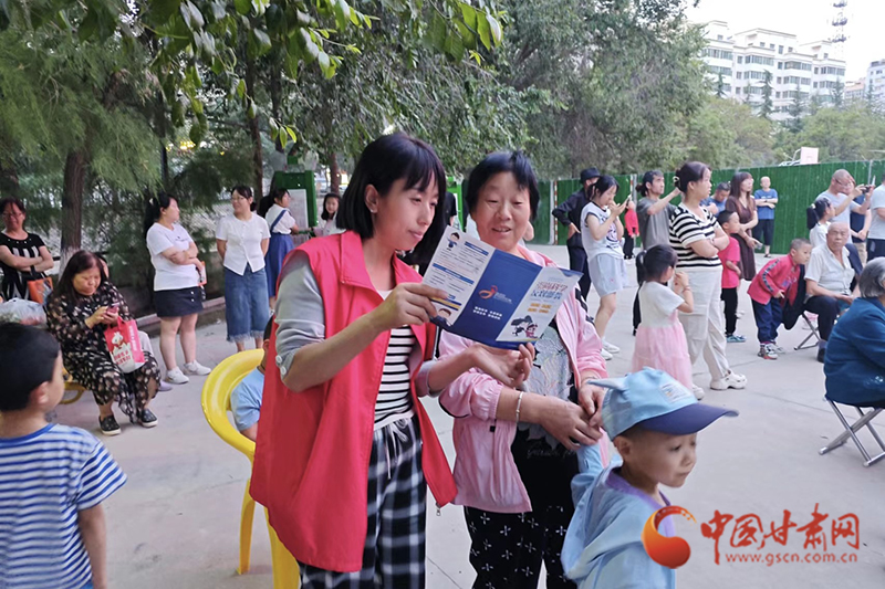 社區(qū)網(wǎng)格員和電影放映員早早到達現(xiàn)場拉幕布、調(diào)音響,緊鑼密鼓地進行準(zhǔn)備工作。夜幕降臨,轄區(qū)居民扶老攜幼、三五成群地聚集起來,廣場上坐滿了前來觀影的居民。網(wǎng)格員、志愿者抓緊時機穿梭在人群中宣傳防詐騙、防溺水、禁毒等知識,以筑牢居民安全意識。