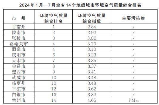 2024年1月—7月,全省14個地級城市環境空氣質量綜合排名由高到低分別為:甘南州、隴南市、張掖市、嘉峪關市、酒泉市、慶陽市、天水市、金昌市、定西市、武威市、臨夏州、平涼市、白銀市、蘭州市。