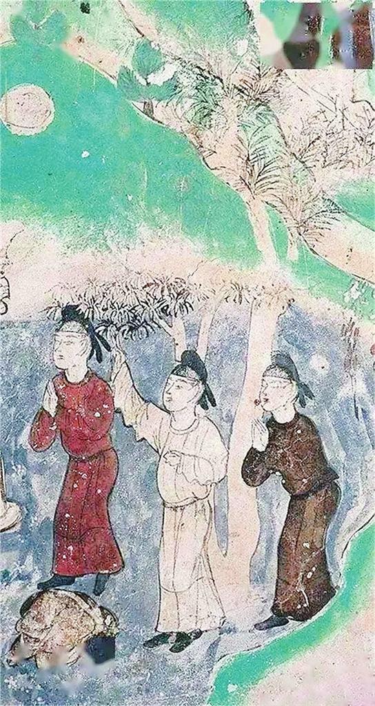 我想,這也是古代敦煌女子在中秋拜月時最真摯的愿望:覓得佳偶、擇得良婿;家庭和睦、永不分離!值得注意的是在敦煌有關相戀男女主題壁畫中總是表現(xiàn)出“有情人必成眷屬”的信念。如在莫高窟第321窟壁畫中有一幅“青年男女圖”、在莫高窟第85窟壁畫中有一幅“樹下彈箏圖”、在榆林窟第38窟壁畫中有一幅“同入青廬圖”等。這些壁畫有著很多相似之處:一是畫面中的男女多穿情侶衫。女性或上衣或下裙總有一個和男性的袍服使用的顏色相同;二是畫面中的情感都是大團圓的美滿結局;三是畫面中男女的情緒都被刻繪得欣喜若狂、堅定執(zhí)著。我想當年這些表達中秋意象的畫匠們一定是為了不辜負這澄澈圓滿的明月吧!
