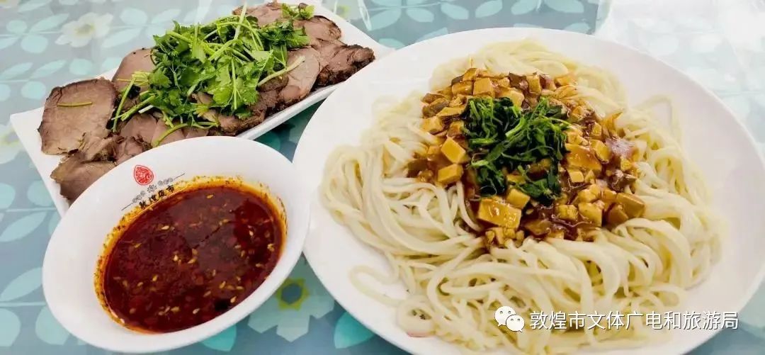 首選一定得是驢肉黃面,這是敦煌的一道傳統特色美食。