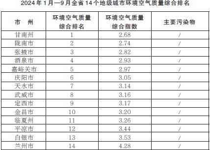 2024年1月—9月,全省14個地級城市環(huán)境空氣質(zhì)量綜合排名由高到低分別為:甘南州、隴南市、張掖市、酒泉市、嘉峪關(guān)市、慶陽市、天水市、武威市、定西市、金昌市、臨夏州、平?jīng)鍪小足y市、蘭州市。