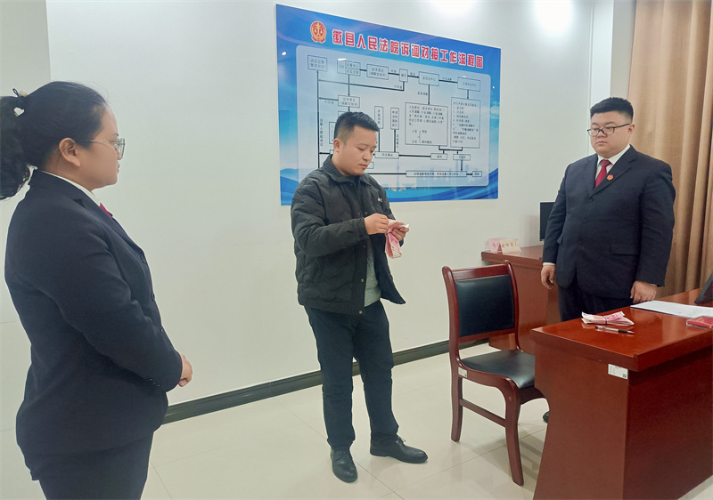 “你看我們也在幫你執行,還有最后的1.5萬元,你執行清楚自己也輕松。”徽縣人民法院賈利輝給被執行人朱某做工作,要求他配合執行。