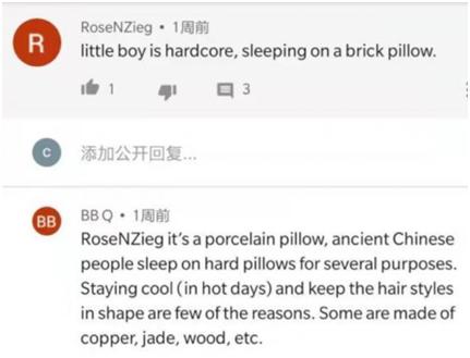 RoseNZieg留言:“這是個硬核男孩兒,睡在石頭枕頭上。”BBQ回復樓主:“這個枕頭是瓷器,中國古人都睡在這種硬枕頭上,還有一些是銅、玉、木頭做的。睡這種枕頭,不冬暖,但夏涼,還能保持飄逸的發型”