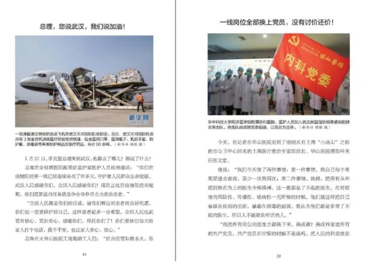 《2020:中國戰“疫”日志》一書以日志的形式,記錄了2020年1月23日到2月23日期間,中國每一天的戰“疫”故事:廣大醫護人員沒有遲疑、沒有退卻,和死神賽跑,與病毒抗爭,為生命接力;堅持工作的人民警察、外賣員、環衛工人、快遞員、志愿者……穿梭在城市的每個角落,守護著自己的城市;許多媒體記者冒著被感染的風險,深入一線采訪報道……