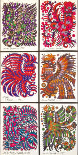 動物系列繪畫,從扎實而靈動的速寫與設計稿直至近似完美的正式作品,都蘊含了畫家捕捉物象的執著與機敏,提煉造型的睿智與不懈,有了心血與摯愛的投入,那成竹在胸別具一格的小貓小狗小豬小鵝小猴也就躍然紙上呼之欲出了。在長方形的深色卡紙上,那銀色勾勒的活靈活現的百魚圖,讓我們沉醉于湛藍的海洋世界;在四方形的白色鏡框中,那七彩斑斕的百雞圖,讓我們迷戀于鄉間的濃郁風情;還有鞠躬盡瘁一生奉獻膂力雄強的牛群系列,馳騁千里挾帶雄風英姿勃勃的駿馬圖騰……