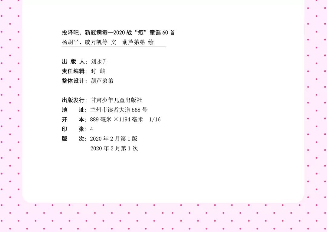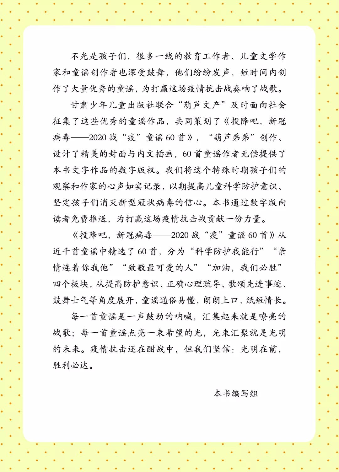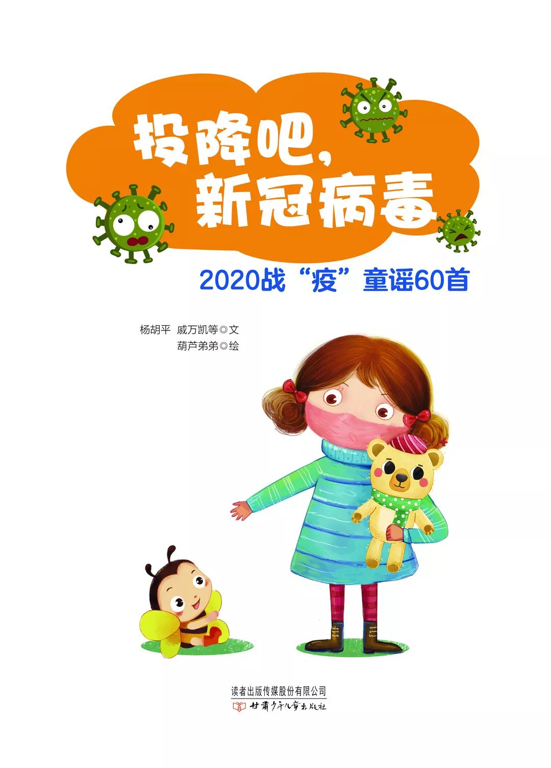 讀者出版傳媒股份有限公司所屬甘肅少年兒童出版社積極響應、主動作為,聯合“葫蘆文產”,策劃了《投降吧,新冠病毒——2020戰“疫”童謠60首》一書,將這些優秀的童謠作品進行編輯加工,以期提高兒童科學防護意識,幫助大家堅定抗“疫”勝利的信心。本書通過數字版向讀者免費推送,為打贏這場疫情防控阻擊戰貢獻一份力量。