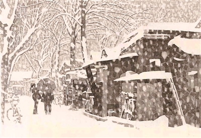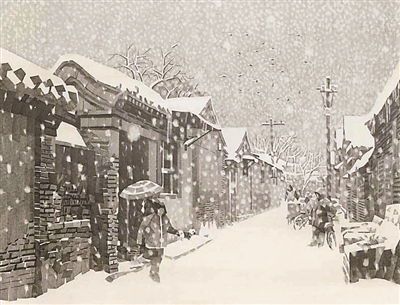 休息日,大雪天,況晗背著畫具出門作畫。濕式水彩畫,講究水色淋漓,是用排筆將清水洇濕畫紙然后作畫。一幅寫生未成,畫筆已然結冰。況晗的家鄉氣候濕潤,墻縫里面生的是青苔。北京的氣候干燥,墻縫里面積存的是數百年的塵土。家鄉村野的色調是青綠,京城胡同的色調是灰白,于是況晗改用寬線條鉛筆畫來寫意胡同。