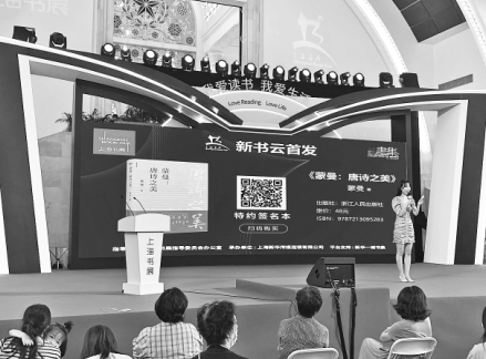 2020上海書展首次啟用了新書“云首發”的形式。8月15日,在《蒙曼:唐詩之美》新書“云首發”現場,讀者可以掃描大屏幕上的二維碼進行圖書購買。