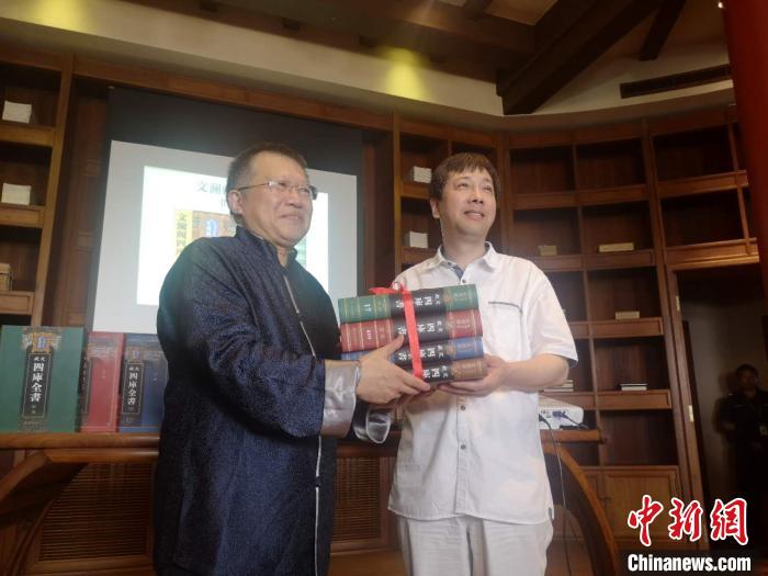 中新網杭州8月26日電(童笑雨)8月26日,浙江圖書館(下稱“浙圖”)向中國國家圖書館(下稱“國圖”)贈送影印精裝本文瀾閣《四庫全書》。據悉,影印本文瀾閣《四庫全書》入藏國圖,尚屬首次。浙江圖書館館長褚樹青表示,文瀾閣本《四庫全書》重新回到北京,是浙江人民的回贈,也是一次文化交流。