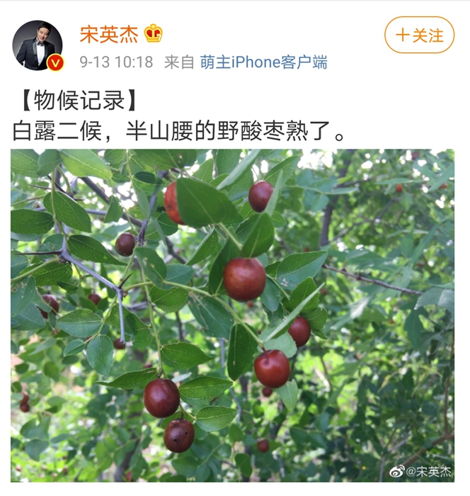 如今,他仍然會隨手在社交媒體上記錄四時風物的變化,前幾天發了一張照片,配文“白露二候,半山腰的野酸棗熟了。”對他而言,隨時關注氣候與物候,已經成為一種習慣。(完)