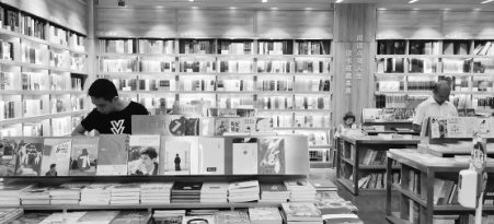 9:00,書店開始營(yíng)業(yè)。走進(jìn)書店,看到店內(nèi)裝修色調(diào)溫和,視野開闊,藏書豐富。臨門迎接讀者的是位于正中央的圓形桌臺(tái),上陳列各類精品圖書,擺放造型精美,儀式感十足。沿著桌臺(tái)外圍是一圈白色座位,可供讀者坐下閱讀。