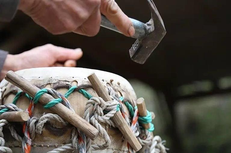 鼓做成后,放在陽光下邊曬邊用重槌敲打,這叫“捶生牛皮”。鼓的聲音是捶打出來的。不捶打,鼓聲出不來,即使這面鼓干到成形了,也是一面啞鼓。鼓槌要用柳木做成,這種由軟木頭做的鼓槌較輕,能在鼓面上彈起來,用硬木頭做的鼓槌不但沒有這種性能,而且容易將鼓敲破。