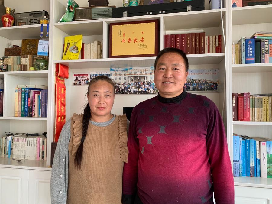 2020年12月10日,牧民敖特根達(dá)來和妻子在自家“書香家庭”獎牌前合影。新華社記者 朱文哲 攝