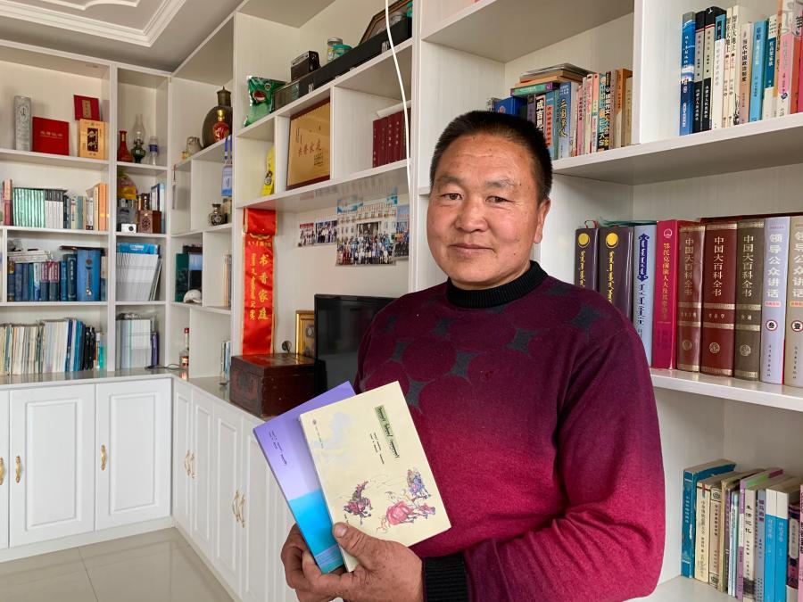 為收藏圖書,敖特根達(dá)來在家里專門建起一間書房。“這是我和其他牧民朋友創(chuàng)作的詩歌散文集。”從書架拿下兩本書的敖特根達(dá)來對記者說,閑暇之余他還會寫些詩歌散文,他的百余篇作品都已在當(dāng)?shù)匕l(fā)表,不久前他還受邀參與到附近巴彥希里嘎查地方志的撰寫中。“鎮(zhèn)里很支持我們的文學(xué)創(chuàng)作,越來越多的牧民開始喜歡閱讀和寫作。”敖特根達(dá)來說。