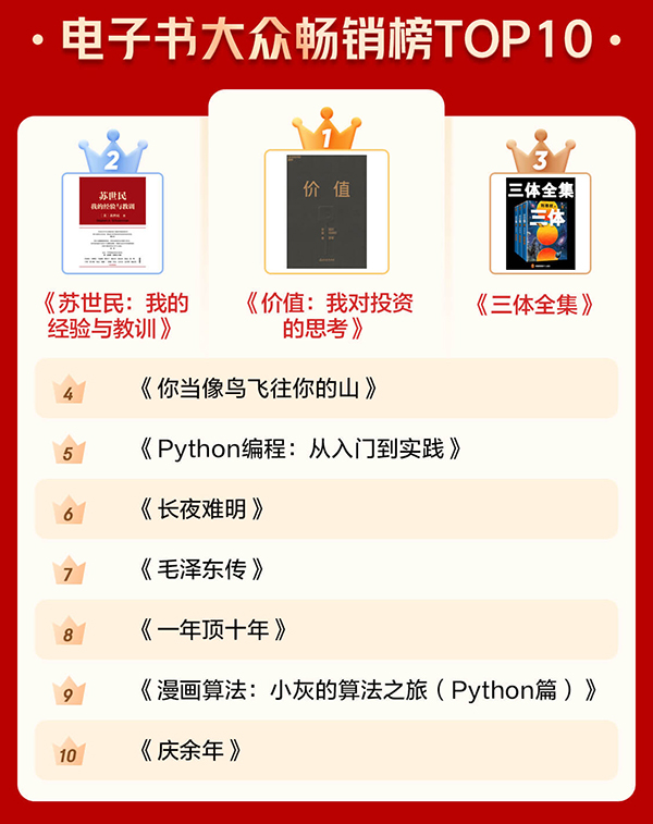 通過電子書暢銷榜TOP10和有聲暢銷榜TOP10可以看出,很多人愈發關注投資和管理等方面的內容,也愈發注重個人學習。《價值:我對投資的思考》《蘇世民:我的經驗與教訓》 分別位居電子書暢銷榜第一名和第二名。《中國經濟2020》《原則》進入有聲暢銷榜前十。此外,學習類圖書《Python編程:從入門到實踐》《漫畫算法:小灰的算法之旅(Python篇)》也上榜電子書暢銷榜前十。