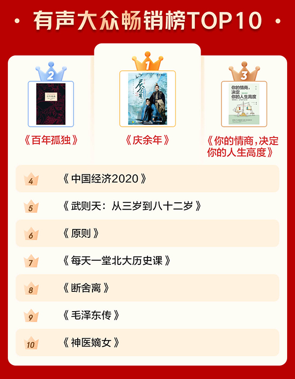 隨著大IP改編影視劇的熱度逐年升高,影視劇原著小說也越來越成為數字閱讀中最暢銷的書籍類型。其中,《慶余年》隨著電視劇的火爆和《慶余年2》原班人馬即將開拍帶來的熱議流量,其原著小說入圍電子書暢銷榜TOP10和有聲書暢銷榜TOP10;改編為《沉默的真相》的紫金陳原著小說《長夜難明》則位列電子書暢銷榜第6名。