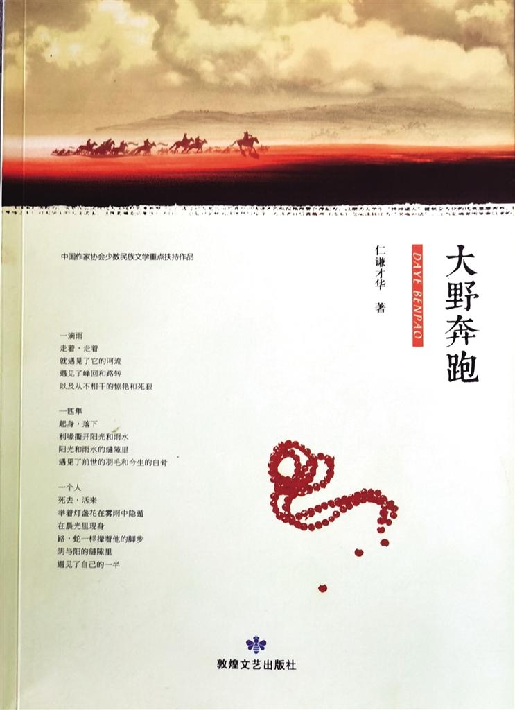 詩歌集《大野奔跑》是仁謙才華近年來的傾心之作,該作品由敦煌文藝出版社出版發行。詩集由作家張存學作序,收錄了仁謙才華4年來發表在《詩刊》等刊物上130余首詩歌。張存學在序中這樣評價:“語言,既是阻礙,也是抵達之路,這個緊張度也是考驗一個寫作者的坎,這個坎過得好一些就能夠把握住詩抵達生命的本真,把握不好,就會在空泛的意象中游走。仁謙才華在這方面的蛻變,從他這本詩集能夠看出,他由早期的直抒胸意、向外張揚變得安靜起來,變得從容而多思,也變得獨立而內在……”