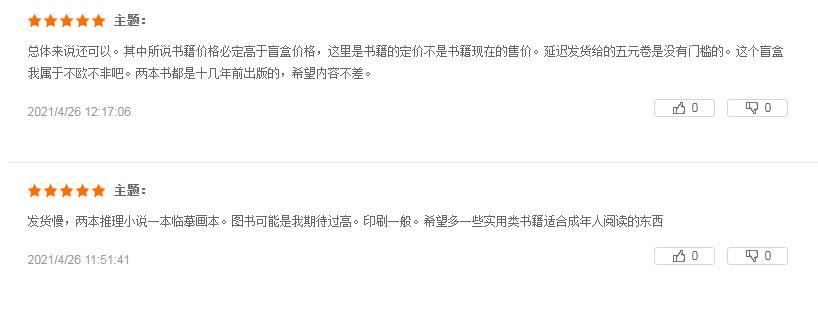 有“歐氣”讀者抽到隱藏款:“等了好久終于收到了,我收到的書都有塑封,不錯不錯,書的豆瓣評分都在七八分左右。”“抽到了隱藏款,開心,是一套推理小說。”;也有人感到書籍不盡人意:“選書有點失望都是舊書的感覺,一本《餌室》,一本《紅色棺材之謎》,有點臟,也能接受,送的文創本子很好看,書袋也不錯,買兩個盲盒都是一樣的文字,不同的顏色,這個有點可惜了。”“發貨慢,兩本推理小說一本臨摹畫本。圖書可能是我期待過高,印刷一般。”