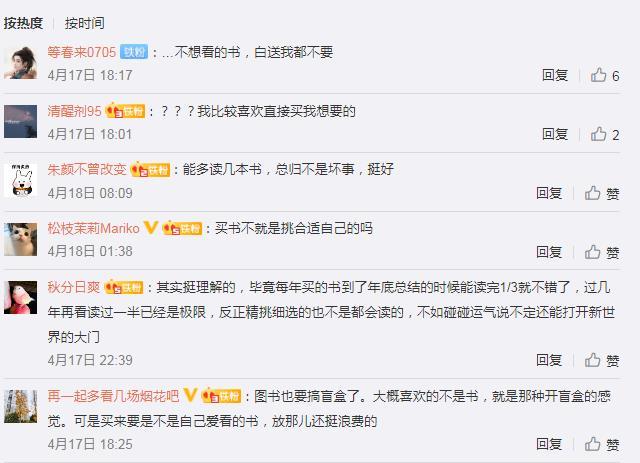 此前,部分網友在中新經緯微博評論對“圖書盲盒”現象開展討論。有網友提到,“其實挺理解的,畢竟每年買的書到了年底總結的時候能讀完1/3就不錯了,過幾年再看讀過一半已經是極限,反正精挑細選的也不是都會讀的,不如碰碰運氣說不定還能打開新世界的大門。”也有網友認為,“不想看的書,白送我都不要”“買書不就是挑合適自己的嗎”等等。