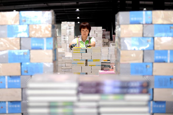 7月2日,在永清縣三圣口鄉一家圖書文化企業倉儲中心,工作人員在整理圖書。