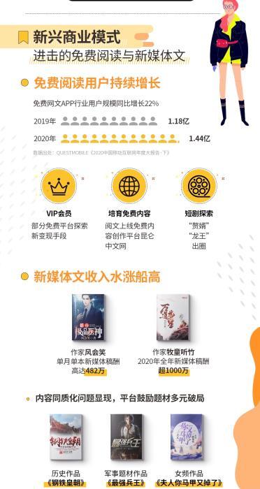 而在近年,免費閱讀和新媒體文成為新興商業(yè)模式,得到快速發(fā)展。其中,免費閱讀和新媒體文激活了下沉市場,成為刺激數(shù)字閱讀市場快速發(fā)展的新興力量,為網(wǎng)絡(luò)文學的內(nèi)容和用戶帶來新增量,也拓寬了網(wǎng)絡(luò)文學市場規(guī)模。
