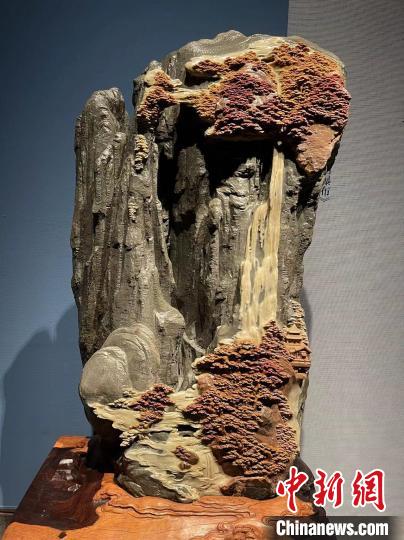 正是因為帶著這些想法,在創作《飛流直下三千尺》時,徐偉軍并不是在山石頂端直接刻出瀑布,而是讓瀑布從一片松林中垂直而下,“途徑”下一片松林,再流向四周,創造出瀑布的磅礴之勢。記者看到,整件作品,氣韻生動。徐偉軍還特地保留了原石粗糙的表皮,刻畫出懸崖峭壁的嶙峋之態。