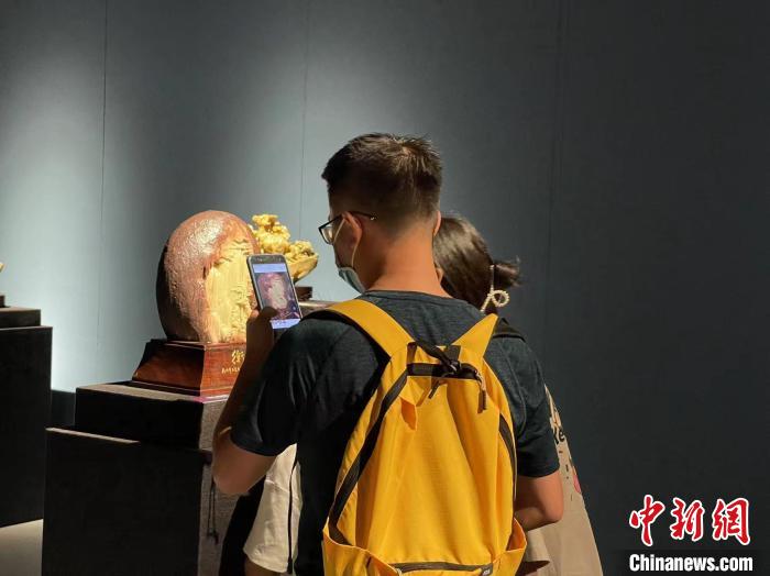 展覽現場的一件石雕作品引得觀眾拍照。 童笑雨 攝