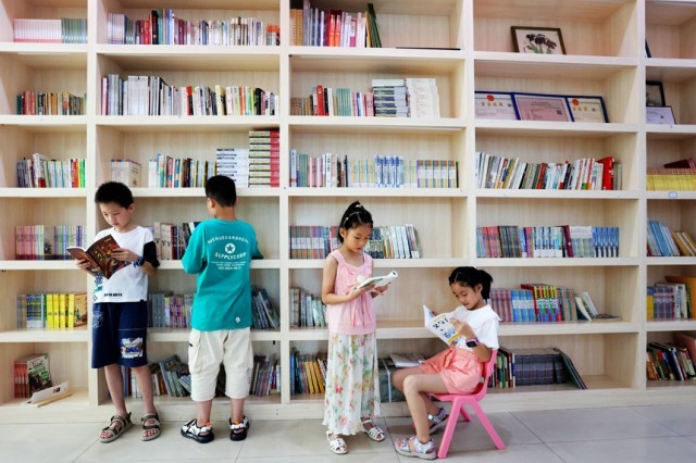 在江西省撫州市東鄉(xiāng)區(qū)千子書院,由東鄉(xiāng)區(qū)政協(xié)教科文衛(wèi)體界別政協(xié)委員打造的圖書角,市民在挑選自己喜歡的圖書。
