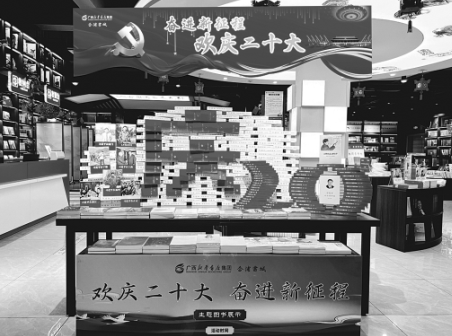 廣西新華書店集團(tuán)股份有限公司組織全區(qū)各連鎖門店先后開展了“喜迎二十大 助力新發(fā)展”主題圖書展示展銷、“歡慶二十大 奮進(jìn)新征程”主題系列活動(dòng)。廣西新華書店集團(tuán)股份有限公司相關(guān)負(fù)責(zé)人介紹,全區(qū)門店近期開展“歡慶二十大 奮進(jìn)新征程”主題門店美陳大賽,通過精選出111個(gè)全國(guó)近期出版的主題圖書品種進(jìn)行重點(diǎn)展示,配套主題海報(bào)、背景板,以各門店融合當(dāng)?shù)靥厣拇a堆造型進(jìn)行整體美陳,向廣大讀者推薦一批導(dǎo)向正確、質(zhì)量上乘的優(yōu)秀主題圖書。