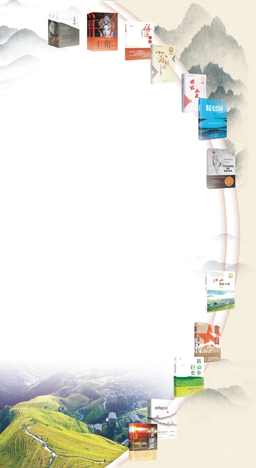 書影圖片從上至下依次為《人世間》《主角》《海邊春秋》《十八洞村的十八個故事》《國家溫度》《琵琶圍》《遠去的白馬》《江山如此多嬌》《靠山》《新山鄉巨變》《西海固筆記》《重卡雄風》(按出版時間排序)。何向陽 供圖;底圖為廣西龍勝各族自治縣龍脊梯田景色。韋吉陽 攝(人民視覺)