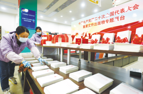 連日來,江蘇省連云港市東海縣新華書店精心設置了黨的二十大重要文件出版物專題展臺,集中展示展銷黨的二十大文件及學習輔導讀物,同時增設閱讀區,市民可以隨時閱讀黨的二十大報告單行本、《黨的二十大報告輔導讀本》、《中國共產黨章程》單行本等圖書,吸引了眾多黨員、學生、市民和機關企事業單位人員等不同群體的讀者前來閱讀選購。