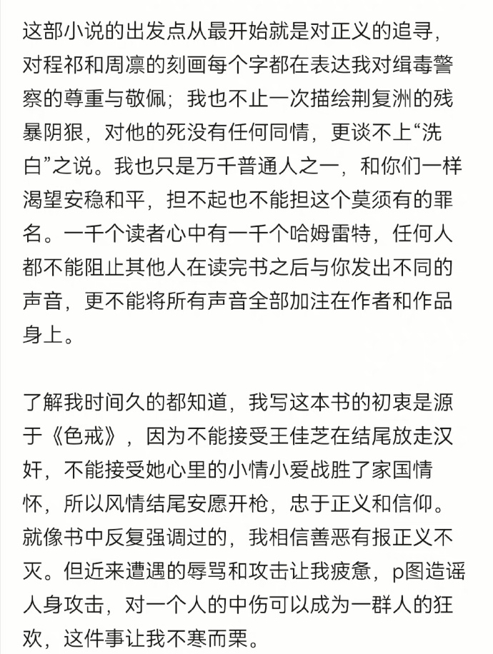 在去年10月14日,疑似《風情不搖晃》的作者在其未經認證的社交媒體賬號上表示,“小說的出發點是對正義的追尋”。在發布這條內容后,其賬號再未更新,該條微博也關閉了評論。