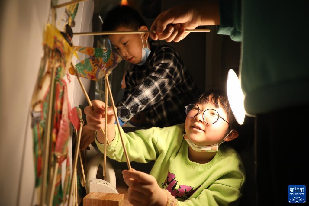 4月1日,在甘肅省蘭州市的讀者出版集團數字閱讀中心讀者小站,小朋友體驗中國神話故事主題皮影戲。新華社記者 馬希平 攝