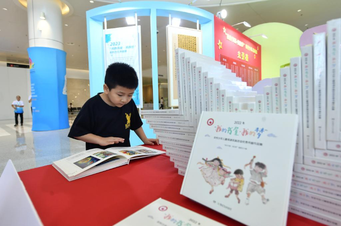 小讀者在書博會上翻看農(nóng)村少兒書畫作品。(組委會供圖)