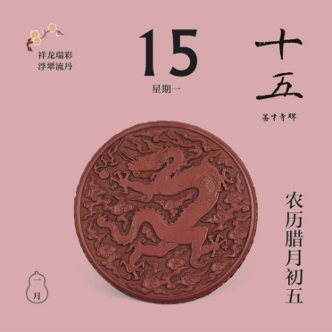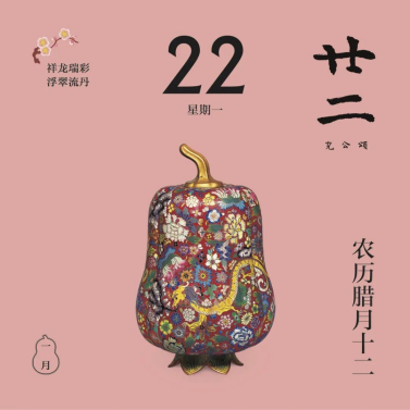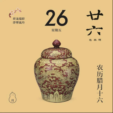 翻開1月月份頁,首先跳入眼簾的,是主題詞“祥龍瑞彩”。這個月以絢麗的顏色為主線,串起各色龍文物,比如精致的宋代單色釉龍紋盤,絢麗的故宮官式建筑和璽彩畫,還有優雅的清代掐絲琺瑯游龍花卉紋瓜式蓋罐……