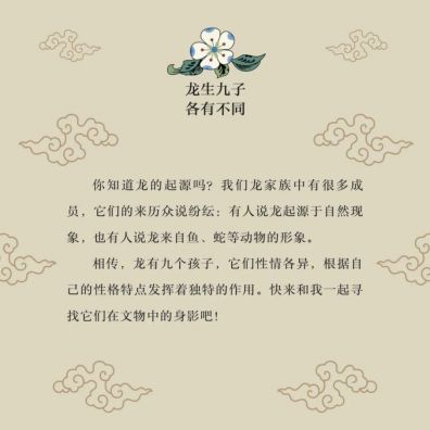 從2月到12月,如意更發現了“龍生九子”的故事,原來,在鐘鈕上的龍子叫“蒲牢”,在宮門上的龍子叫“椒圖”……在古老的龍家族中,有把身子彎成S形的螭龍,有在空中振翅飛舞的應龍,還有拱起身子趴在壺上的蟠龍……精選的故宮官式建筑上的和璽彩畫、大氣精美的九龍壁和千龍吐水的螭首奇觀,都讓如意著迷而向往。